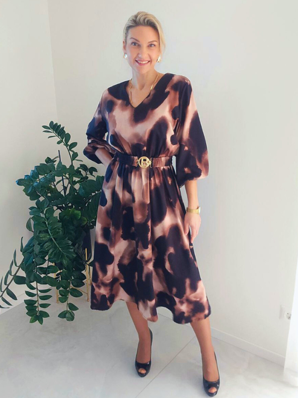 Elegantiška midi ilgio suknelė su išskirtiniu raštu ir dailiai krintančiu siluetu. Modelis turi patogų liemenį su guma bei komplekte esantį diržą, kuris leidžia lengvai pabrėžti taliją ir prisitaikyti prie figūros.