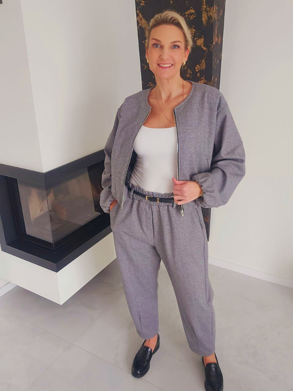 Šiltas dviejų dalių kostiumas moterims, sudarytas iš bomberio tipo švarkelio su užtrauktuku ir bananinio tipo kelnių su diržu. Kostiumas su pamušalu, todėl puikiai tinka vėsesniam sezonui ir kasdieniam komfortui.