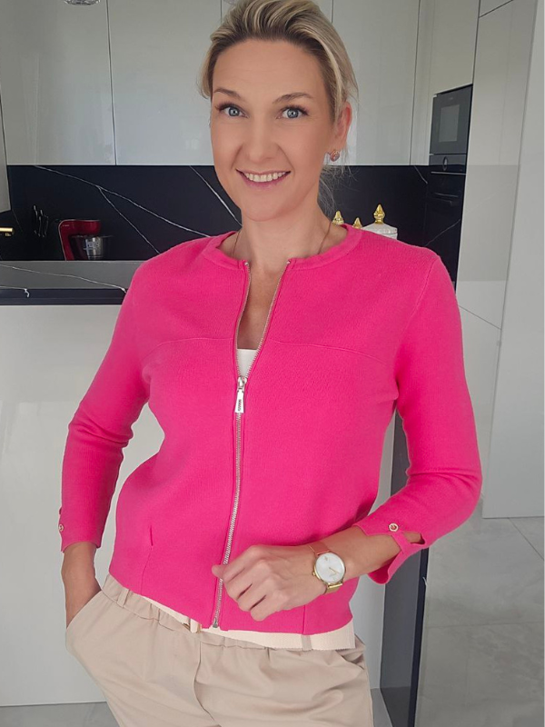 Ryškios fuksijos spalvos megztinis su užtrauktuku – stilingas ir patogus pasirinkimas kasdieniam bei tvarkingam įvaizdžiui. Dailiai priglundantis siluetas suteikia tvarkingą išvaizdą, o užtrauktukas leidžia megztinį lengvai pritaikyti skirtingiems deriniams.