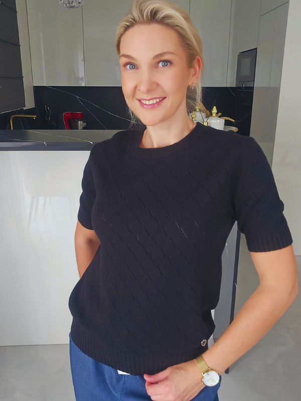 Šilta juodos spalvos palaidinė trumpomis rankovėmis – elegantiškas ir universalus pasirinkimas vėsesniam sezonui. Subtilus tekstūrinis raštas suteikia išskirtinumo, o klasikinis siluetas gražiai priglunda ir atrodo tvarkingai.