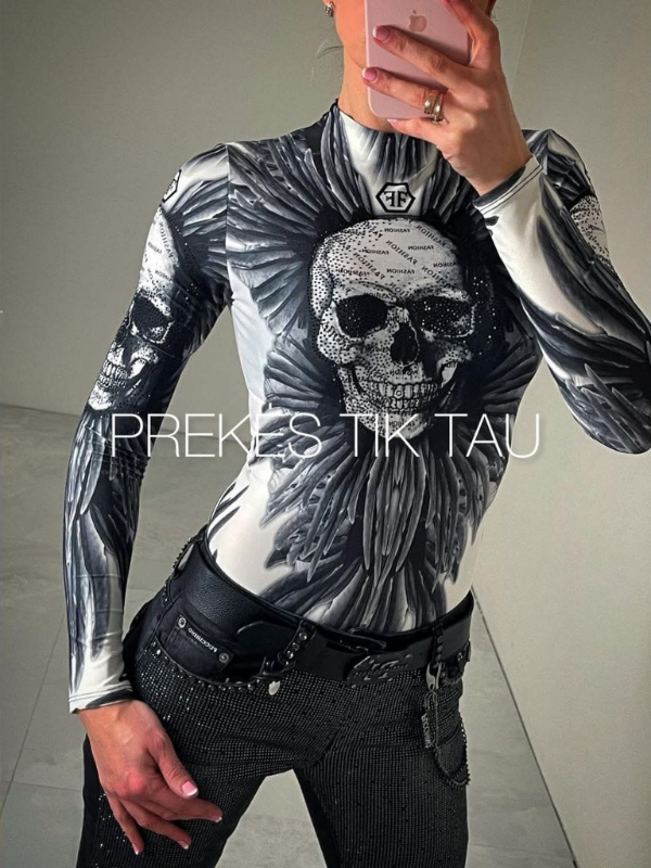 Išskirtinio dizaino juodas bodis su dekoratyviniu kaukolės motyvu ir subtiliais blizgučiais. Modernus raštas suteikia drąsaus charakterio, o prigludęs siluetas išlaiko elegantišką ir stilingą įvaizdį.