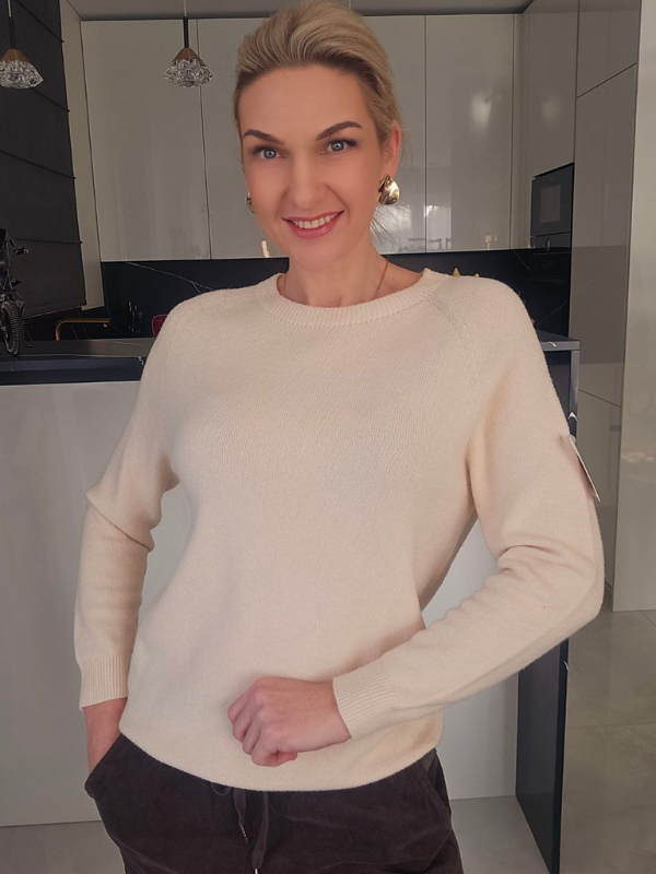 Klasikinio stiliaus kreminės spalvos viskozinis megztinis moterims, sukurtas patogiam ir stilingam kasdieniam nešiojimui.