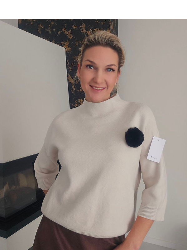 Elegantiškas ir jaukus moteriškas megztinis su nusegamu dekoratyviniu bumbuliuku, leidžiančiu lengvai keisti įvaizdį.
