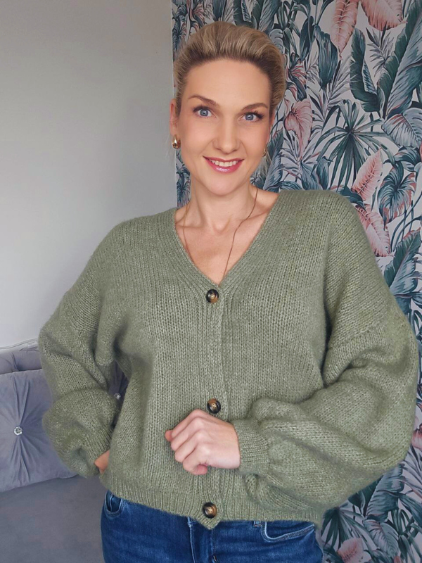 Moteriškas megztinis su sagomis, universalaus dydžio. Laisvo silueto modelis, patogus kasdieniam dėvėjimui. Tinkamas derinti su kelnėmis ar sijonais.