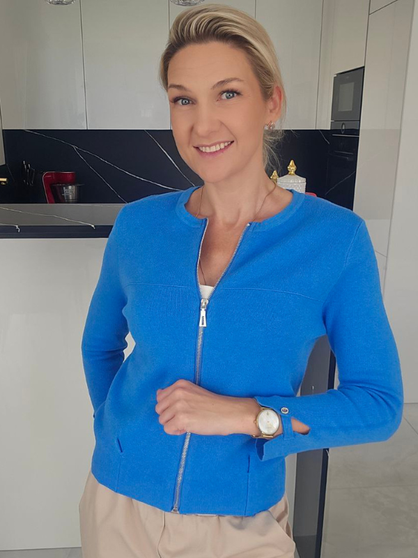 Klasikinės mėlynos spalvos megztinis su užtrauktuku – patogus ir elegantiškas pasirinkimas kasdieniam bei tvarkingam įvaizdžiui. Dailiai priglundantis siluetas suteikia tvarkingą išvaizdą, o užtrauktukas leidžia lengvai prisitaikyti prie skirtingų derinių.