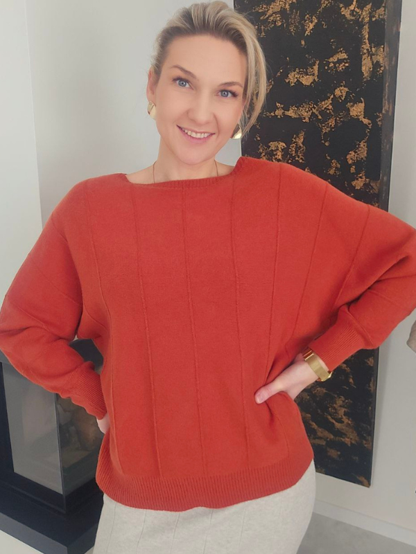 Stilingas plytų spalvos kimono stiliaus moteriškas megztinis, išsiskiriantis laisvu siluetu ir subtiliu, dailiu kritimu.