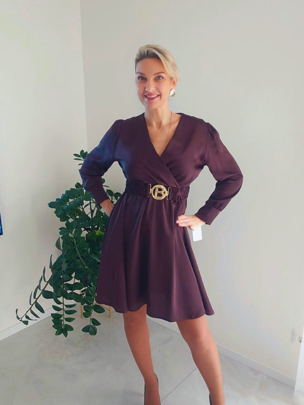 Elegantiška šokolado spalvos suknelė, pasiūta iš lengvo, lyg šilkas krintančio audinio. Modelis su dailia V formos iškirpte ir elastinga juosmens linija gražiai priglunda, suteikdamas moterišką ir subtiliai prabangų įvaizdį.