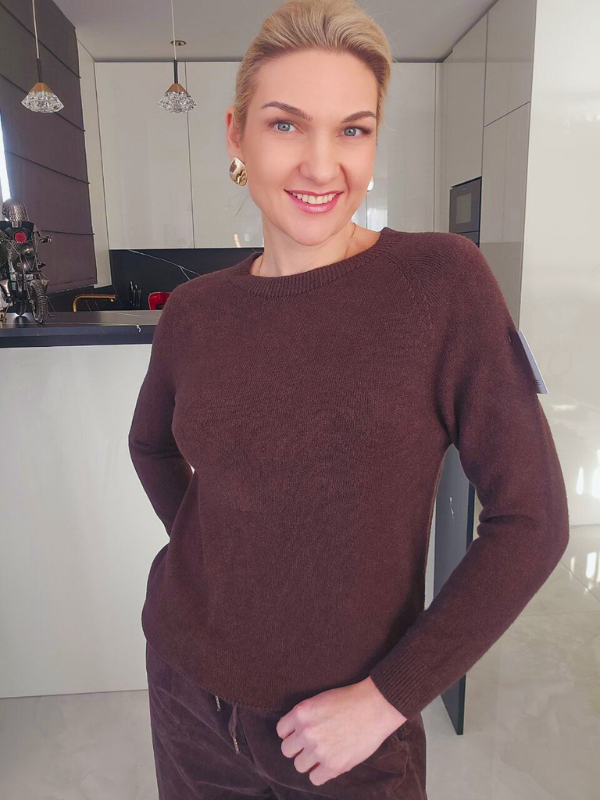 Šokolado spalva lengvai derinama su neutraliomis ir žemiškomis spalvomis, todėl megztinis puikiai tinka tiek kasdieniam, tiek tvarkingam miesto stiliui.