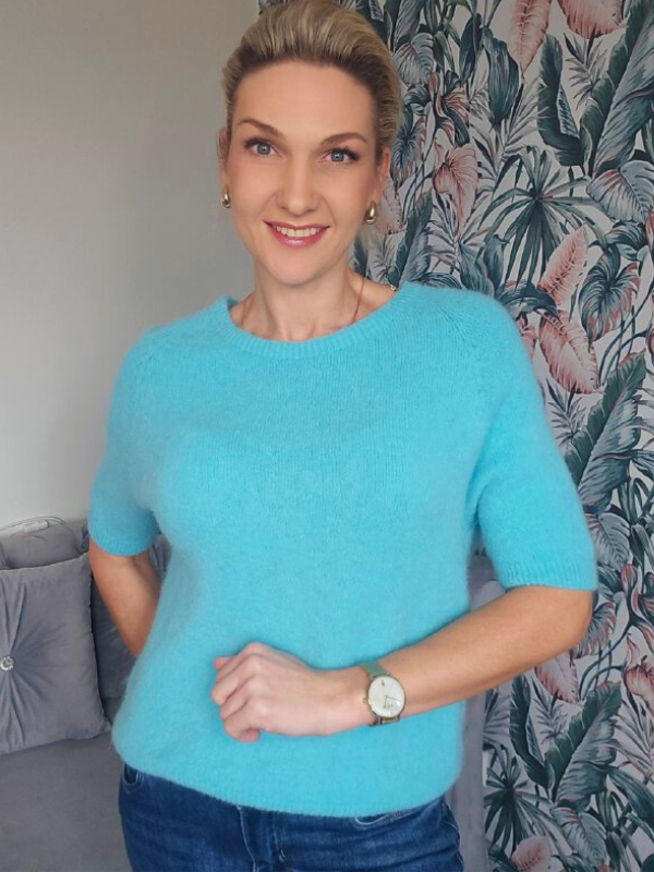 Švelnios žydros spalvos premium kokybės alpaka megztukas – elegantiškas, jaukus ir išskirtinai malonus kūnui pasirinkimas. Klasikinis siluetas su trumpomis rankovėmis suteikia lengvumo, o aukštos kokybės sudėtis užtikrina komfortą ir ilgaamžiškumą.